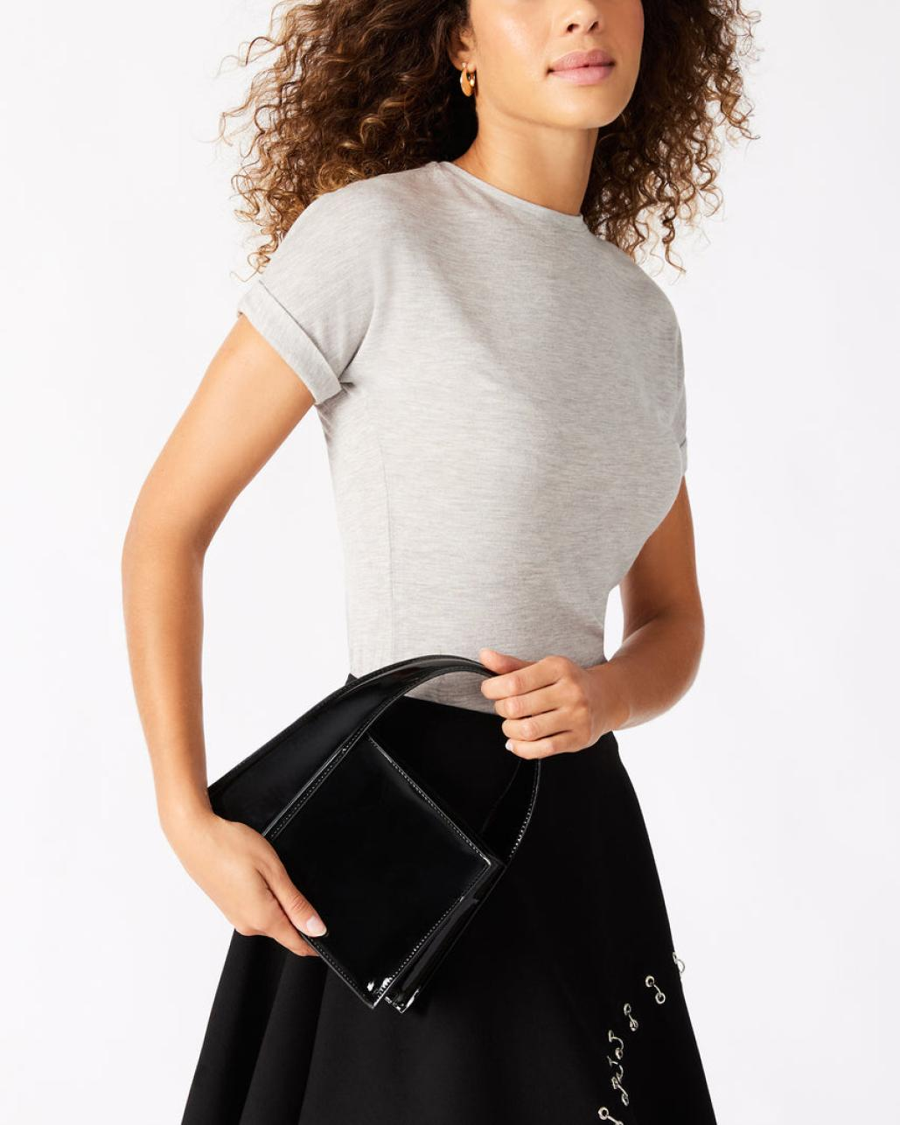 A structured trapezoid bag with a twist, the TWISTY bag features a top handle that’s attached diagonally across the top of the bag, adding a twist to the strap for a comfortable hold.